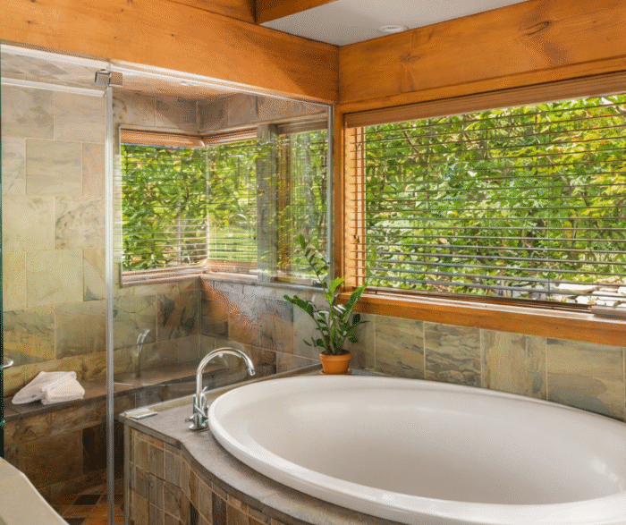 From its curving slate roof, to its timeless stone floors, Stone is a stunner from top to bottom. Impressive stacked pillars grace the front porch, while the interior welcomes you with surprising warmth. A large double-sided fireplace echoes the outdoor pillars, while separating a raised main bedroom that features a gorgeous live-edge wooden headboard, from an elegant living room replete with welcoming chairs and a soft leather couch that converts to a sofa bed.