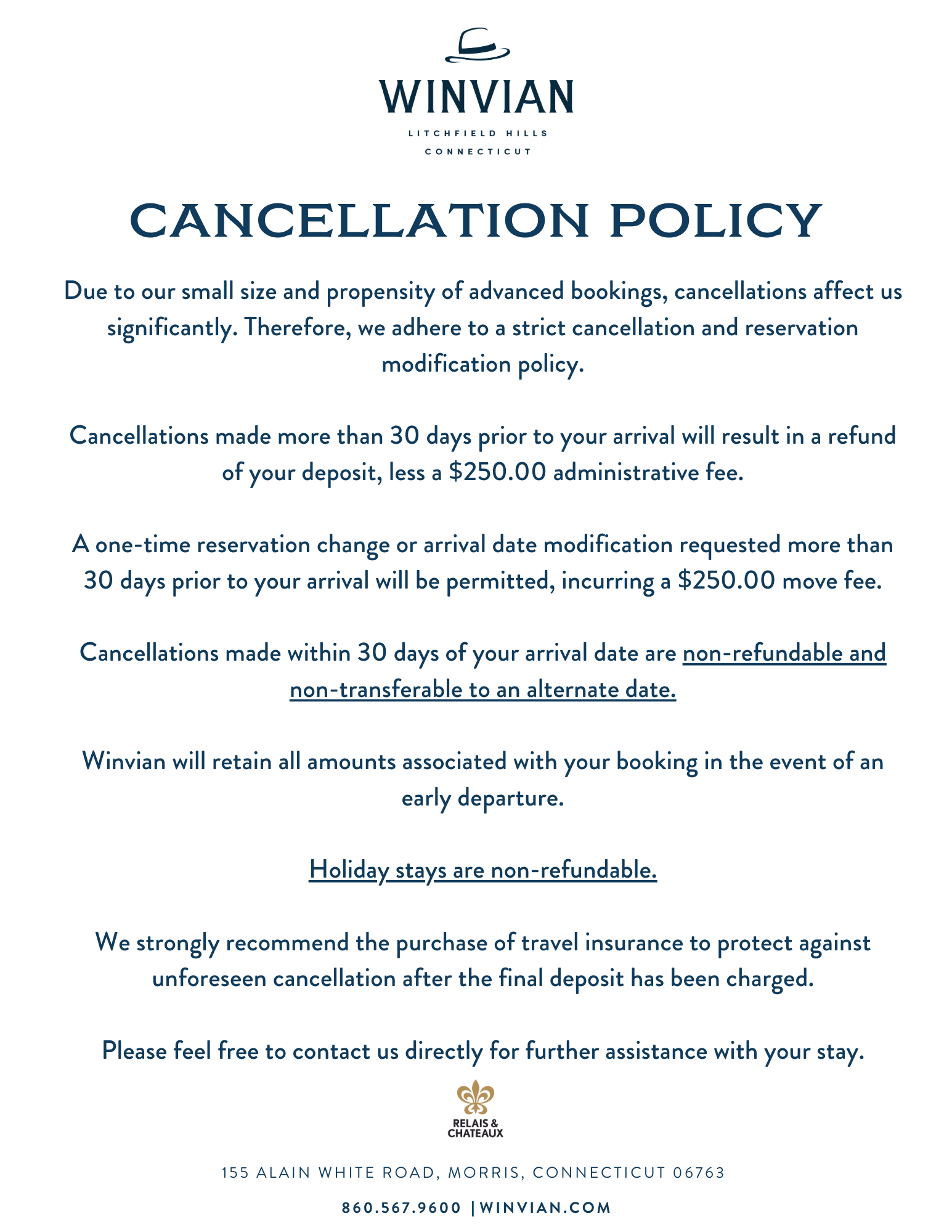 Winvian requires a 50% deposit of the lodging total (including taxes) at the time of booking. The remaining 50% deposit will be charged 30 days prior to arrival. If booking within 30 days of your arrival, a full 100% deposit will be required.